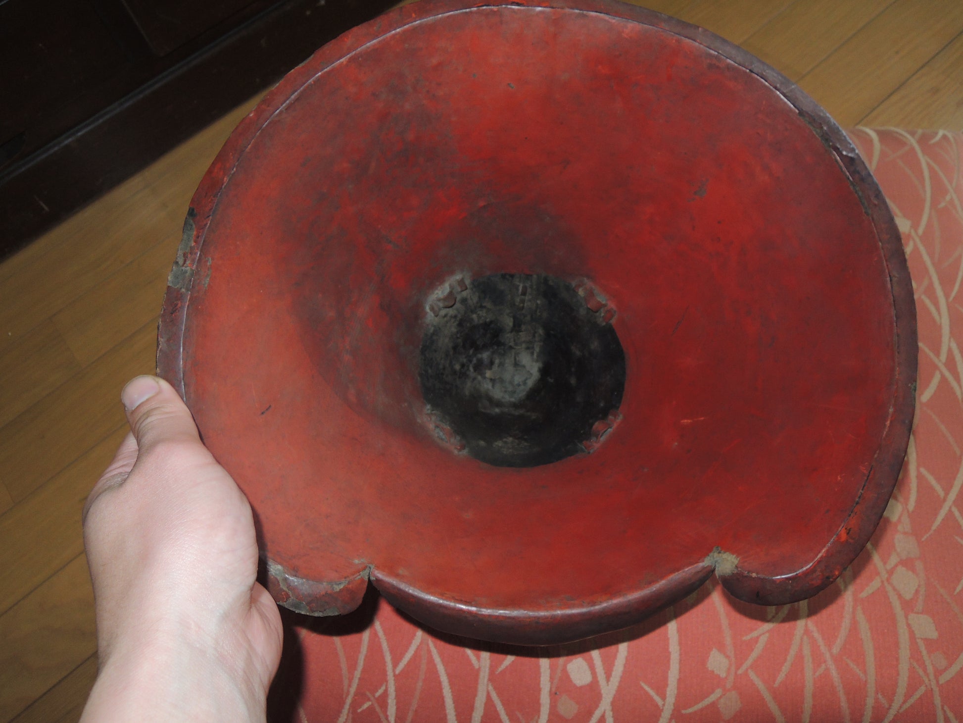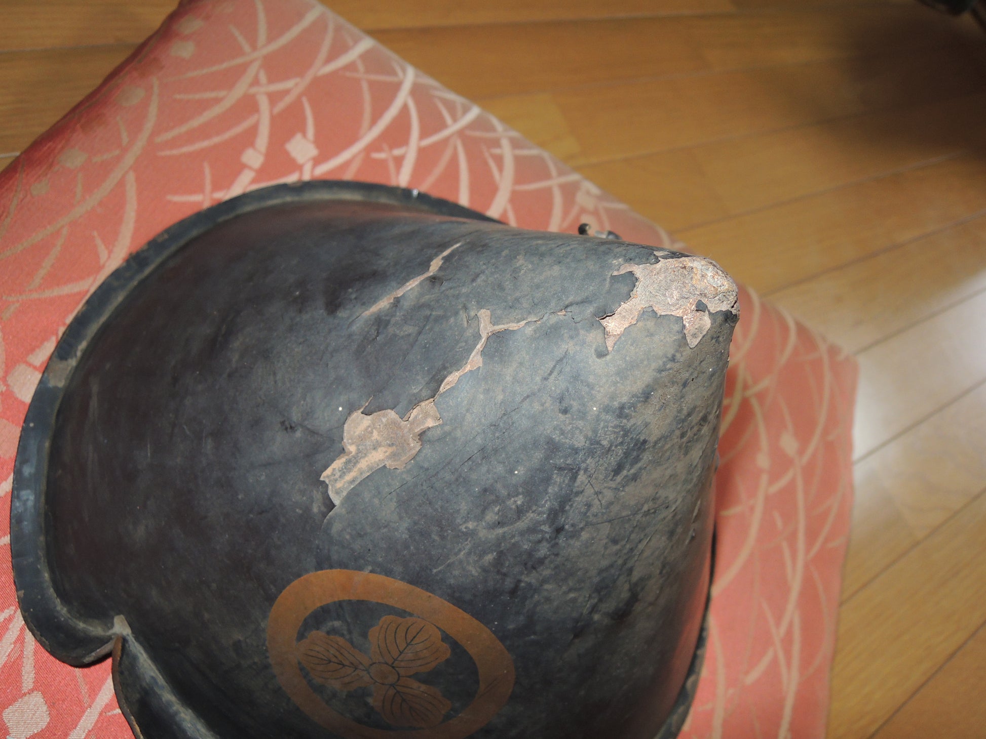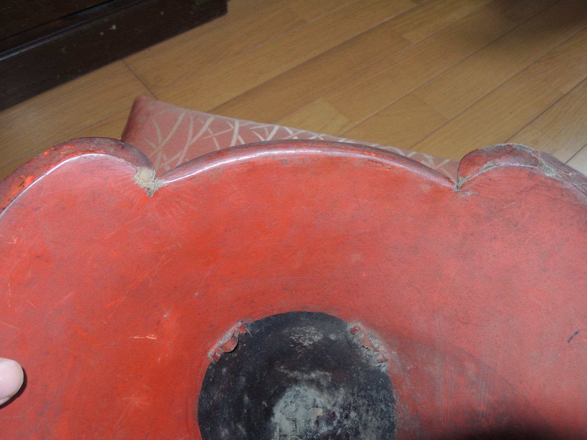 Lacquer coating is cracked or peeling in some areas.